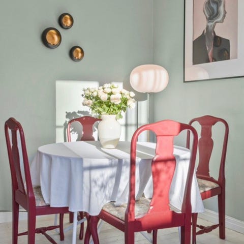Spisebord og stoler pent bruk av eldre ektepar i mange år. Har noen riper i bordplate og på noen av stolene. Bordet er tregt å dra fra hverandre, trenger smøring. Bord - lengde 135cm, høyde 77 cm og bredde 105 cm. Ekstra bordplate 32 cm. Stolene - total høyde 99 cm, setehøyde 49 cm, bredde 48 cm.