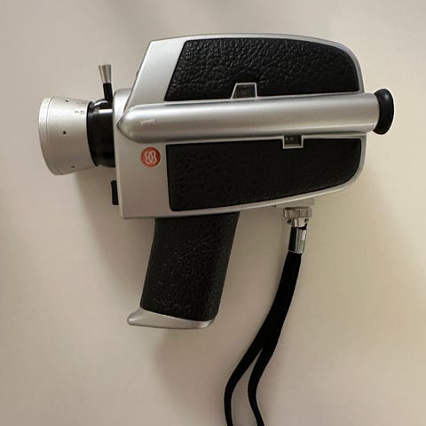 Gammelt Bauer C28 Special filmkamera fra ca 1977 med manuell betjening. Kameraet er utstyrt med søker, zoomkontroll og håndtak for enkel bruk. Bruker filmruller. Tar ikke opp lyd.
