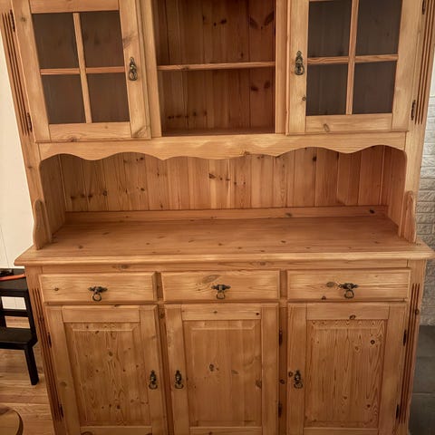 Søkeord: seksjon, veggseksjon, reol, beito, furu, furumøbel, vitrineskap, heltre, kjøpmannsdisk, skatoll, renovere, male, fikse, pusse, hytte, pine wood, skap, skuffer, håndtak, hyller, glassakap,