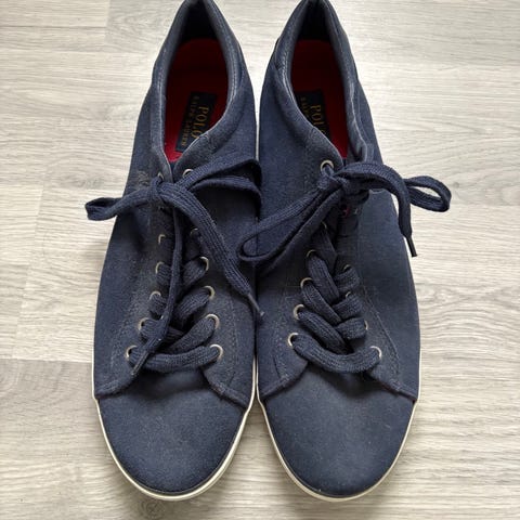 Polo Ralph Lauren sko i blå farge, størrelse 44. Skoene har en lav profil med snøring og gummisåle. Materialet ser ut til å være tekstil eller semsket stoff. Passer til hverdagsbruk.