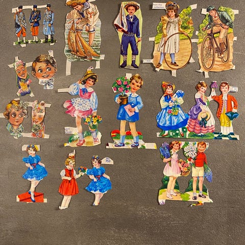 Klassiske glansbilder med preg. Litt ulik alder. Bildet med gul blomsterkrans har en liten rift.