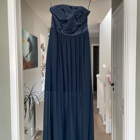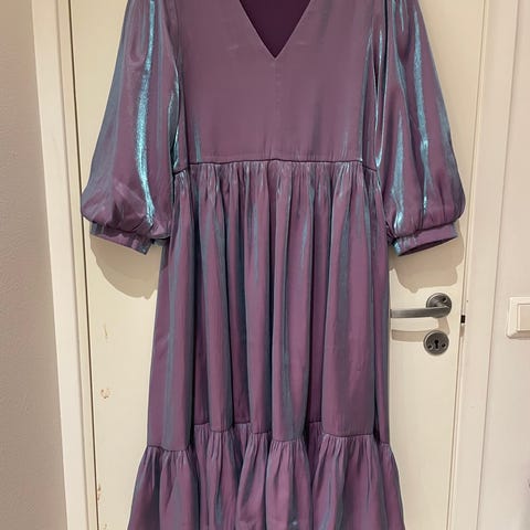 Selected Femme festkjole i størrelse 38, laget av polyester. Kjolen er blå og har et mønster med tekstur. Den har v-hals og puffermer, samt et belte i livet for justering. Passer til formelle anledninger.