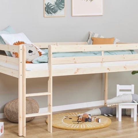 Perfekt høyde for mindre barn : Sengen har en ideell høyde som gjør det enkelt og trygt for barn å klatre opp og ned, og skaper plass til lek og oppbevaring under sengen, uten å virke utrygg for mindre barn.