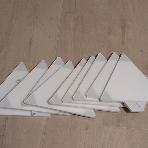 Selger 9 stk. Nanoleaf Shapes (trekantpaneler) – perfekt til gaming-setup, stue, soverom eller hjemmekontor. Gir stemningsfull belysning og kan settes opp i valgfritt mønster.