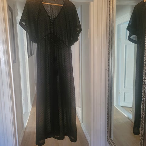 Åpen kaftan, fin til å slenge over bukse/topp, annen kjole eller på stranda. Hel lengde fra skulder va 93 cm, 3/4 lange vide ermer. Ikke belte.
