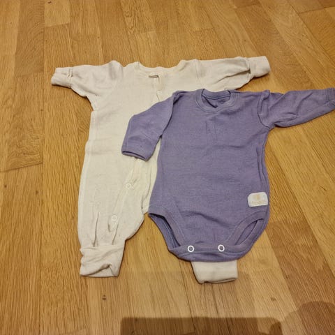 1 vinterlue med hals, hjemmestrikket skjerf til baby, votter til små hender og ett sett hjemmestrikkete sokker.