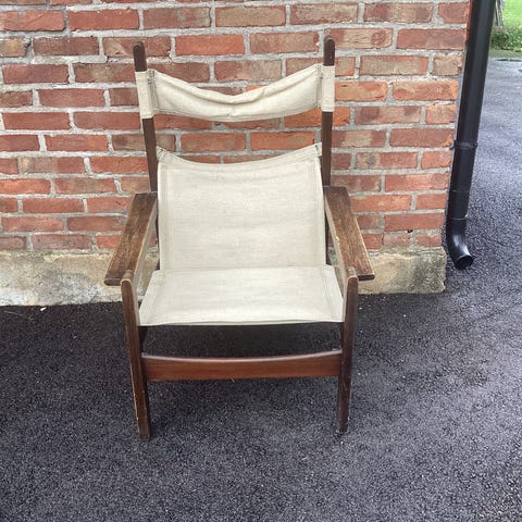 Klassisk designstol fra Sørlie møbler. Mørk brunt tre, rødt trekk. En skrue på siden er erstattet/ikke original. God stand, men nå en skraper på armlenene.