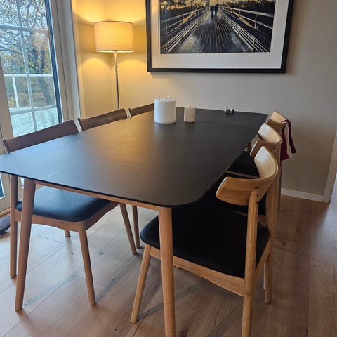 Malt klassisk spisebord. Er en del bruksmerker og ileggsplata er gulnet litt, men bordet er fortsatt veldig fint. Bordet er 160 cm uten ileggsplate. Kan følge med 4 stoler, men disse er i varierende stand.