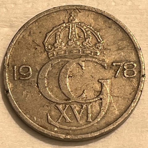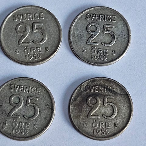 Sverige 25 Öre mynt fra 1949. Myntens forside viser verdien 25 Öre og årstallet 1949, baksiden viser en krone. Mynt laget av sølv
