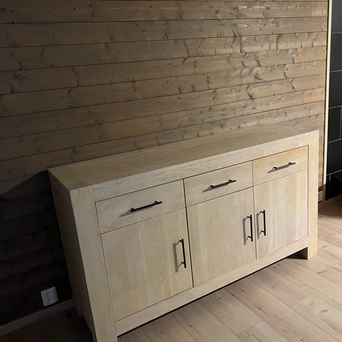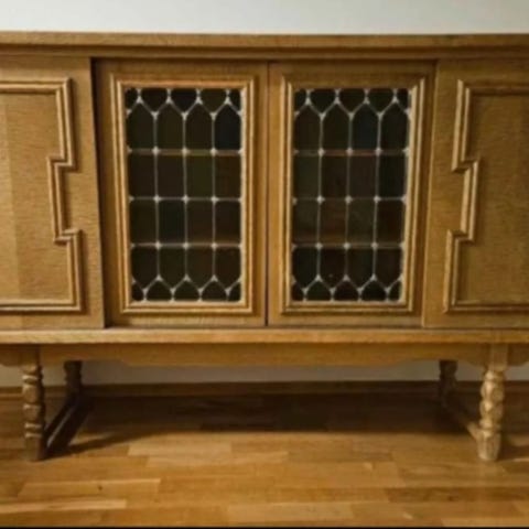 Pent brukt skjenk/kommode i heltre eik selges for kr 1500. Den har tre skuffer øverst og tre dører. Ingen synlige skader eller bruksmerker.