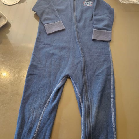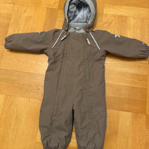 Varm vinterdress med avtakbar fuskepels på hetten. Hetten er også avtakbar, og kan i tillegg regulerende borrelås på toppen. Glidelåslomme på siden og strimler under føttene. Pent brukt av ett barn og uten synlige bruksmerker (bortsett fra noen knapt synlige skjolder på refleksene på ermene). Metallisk innermateriale i rumpa, som beskytter litt ekstra mot kulda.