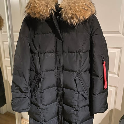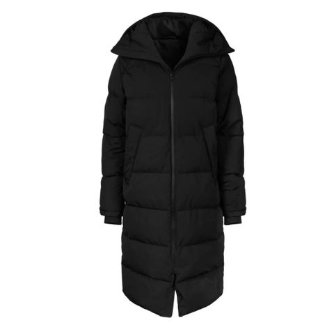 Frostin Down Parka fra Clermonte er en deilig dunkåpe i klassisk sort farge. Kåpen har høy krage og hette og grovt glidelås foran.