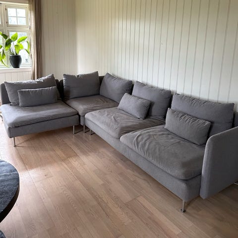 En behagelig sofa fra Ikea, med sjeselong og god sitteplass.