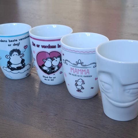 Innhold i esken: kaffekopp, liten tekopp, vannglass og to skåler, som vist på bildet.