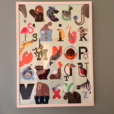 Kosedyr alfabets tavla, hengt på vegg.