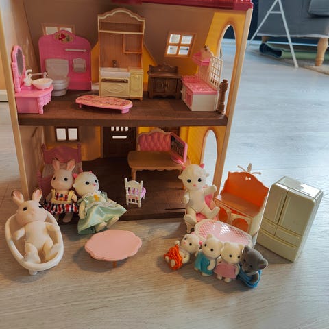 Pent brukt Sylvanian hus med møbler/utstyr, flere figurer og en bil.