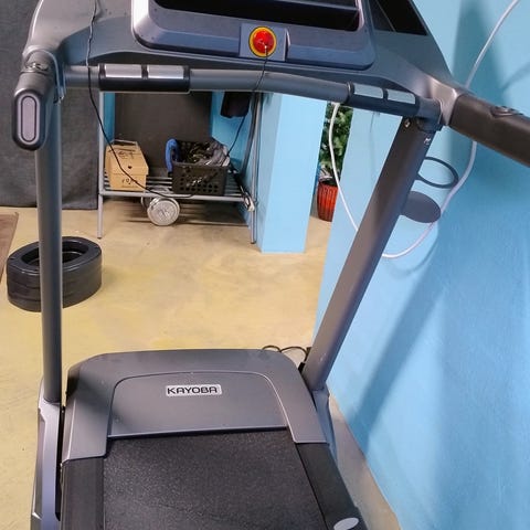 er en kompakt tredemølle i svart farge. Den har et digitalt display for tid og hastighet, og en sammenleggbar design som gjør den enkel å oppbevare. Egnet for innendørs gange og lett jogging.