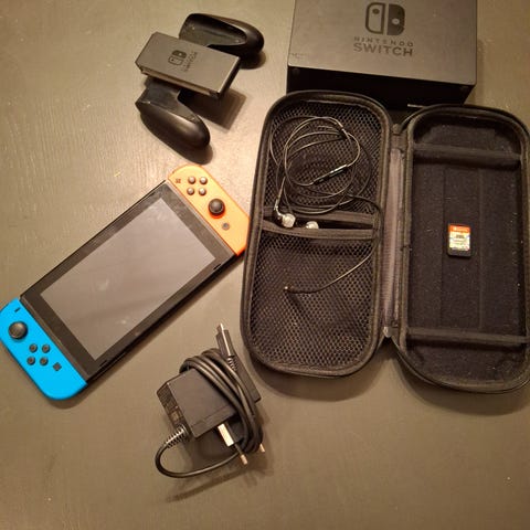 Nintendo Switch spillkonsoll med blå og rød Joy-Con-kontrollere. Konsollen inkluderer en dock for tilkobling til TV og Joy-Con remmer for håndleddsfeste. Enheten er bærbar og kan brukes både som håndholdt konsoll og tilkoblet TV.