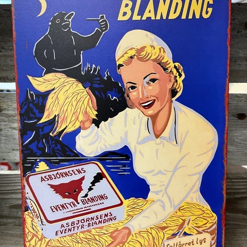 Skilt i Tynnmetall reprodusert med bilde av: Asbjørnsens Eventyr Blanding, det er ingen tobakk som 20X30 cm. Hentes eller sendes mot porto kr 65,- m/sporing eller med Fix ferdig. Ønsker du og kjøpe flere varer på en frakt, ta kontakt før du kjøper. For og se mine andre annonser, trykk på profilbilde og så annonser. NB! ER PÅ JOBB MAN - FRE MELLOM 06:30 - 16:00. NOEN GANGER MÅ JEG VENTE TIL ETTER JOBB MED OG SVARE. mvh Carsten