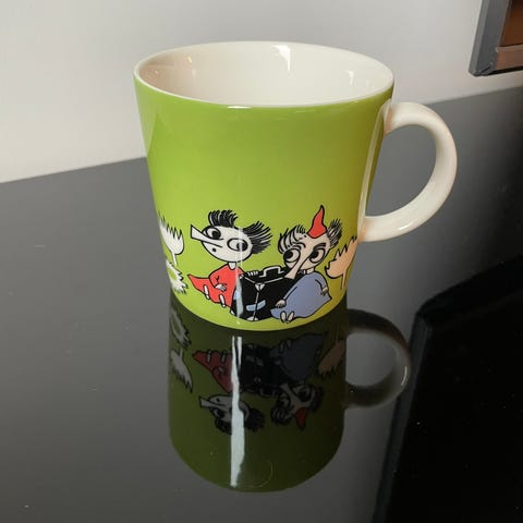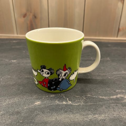 Dette grønne Mummi-kruset fra Arabia fra 2018 forestiller Tusla og Visla og kongens rubin. Det er vakkert illustrert av Arabia-kunstneren Tove Slotte, og illustrasjonen kan sees i originalboken "Mummifamilien Finn" av Tove Jansson.