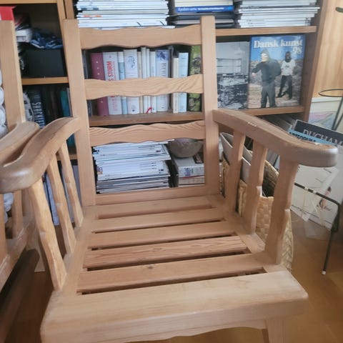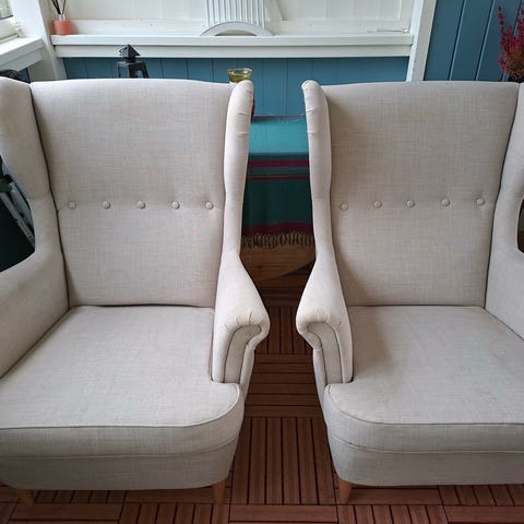 To grå lenestoler fra Jysk. Ben i massiv eik.