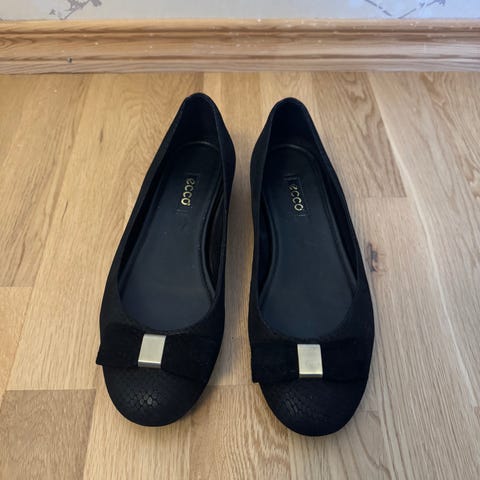 ECCO ballerinasko i størrelse 40. Skoene er gullfarget med perforerte hull og en liten sløyfe foran. God såle til ballerinasko å være.