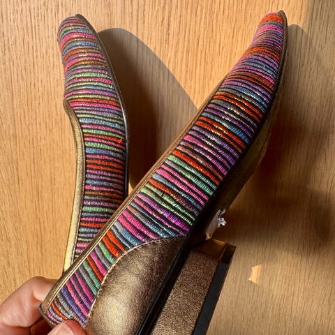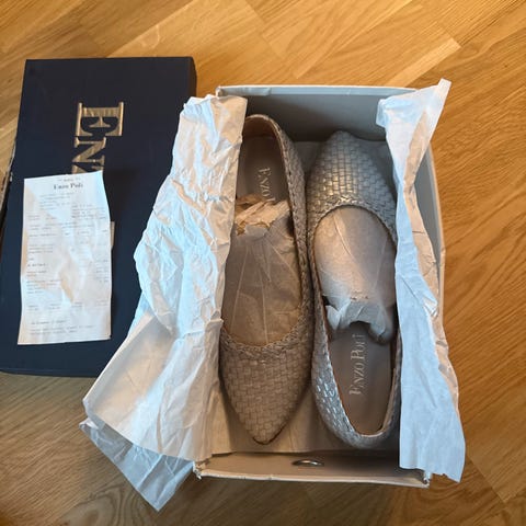 Fine italienske ballerinasko med veske. Mørkeblå, glitrende. Str. 37. Aldri brukt.