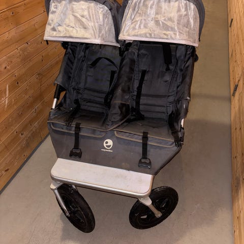 Easywalker dobbel barnevogn i blå farge. Barnevognen har to seter side ved side, egnet for to barn. Vognen har avtagbar festebøyle, og er sammenleggbar for enkel transport og oppbevaring.