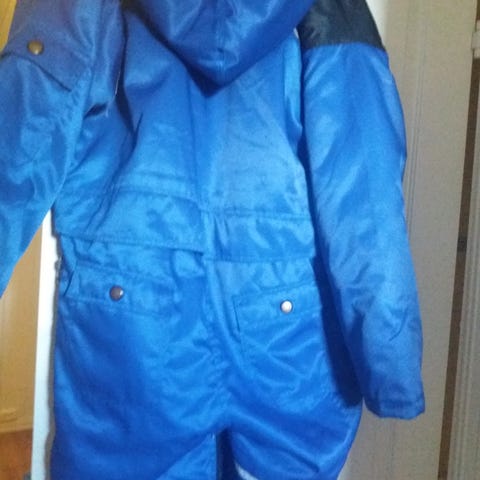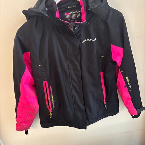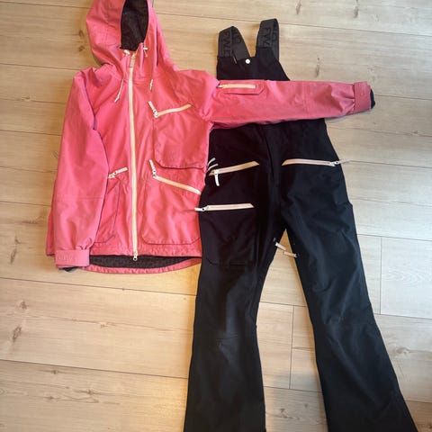RETRO outfit: rosa/rød jakke (helforet) med hette, 2 stikklommer, 2 lommer med knapping, lukking med glidelås + skinnhemper m/lukking.