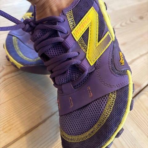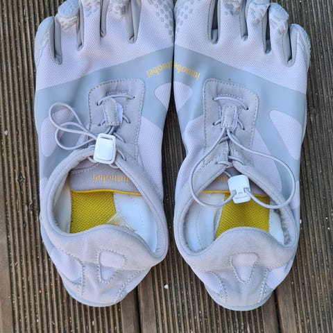 Vibram løpesko i størrelse 36 med femtådesign. Skoene har en kombinasjon av rosa og grå farger, og er laget for løping. Materialet og sålen er tilpasset for å gi god kontakt med underlaget.