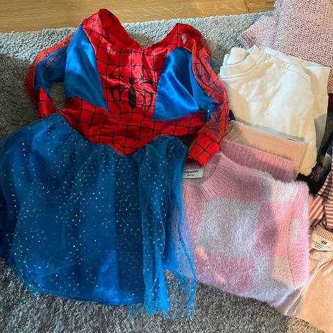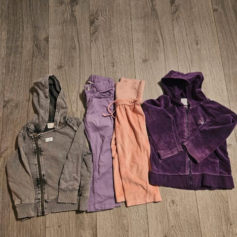 Utvalg av barneklær for jente i størrelse 110/116 med flerfarget design. Inneholder ulike plagg i forskjellige farger og mønstre, egnet for barn i angitt størrelse.