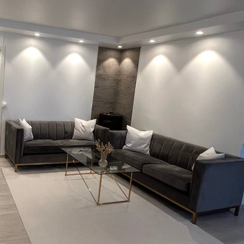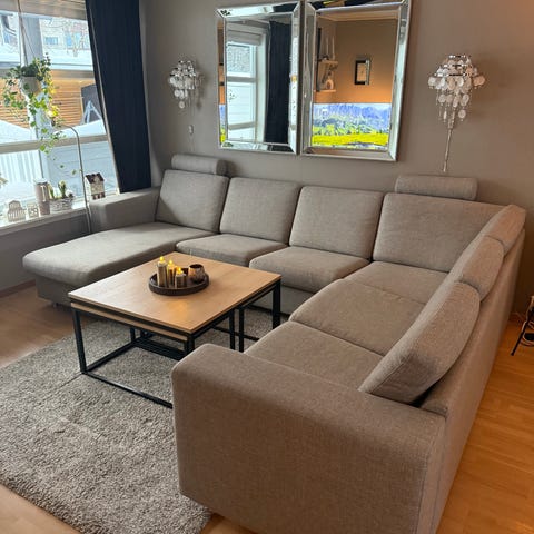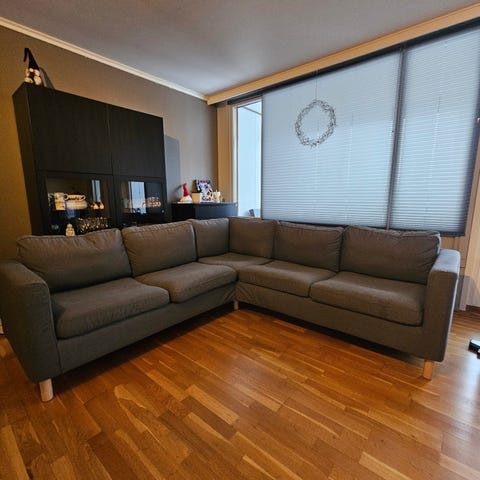 Blå Landskrona sofa fra IKEA selges. Følger med en pall. Kjøpt i juli 2024. Selges pga flytting. Har stått i hjem med hund.