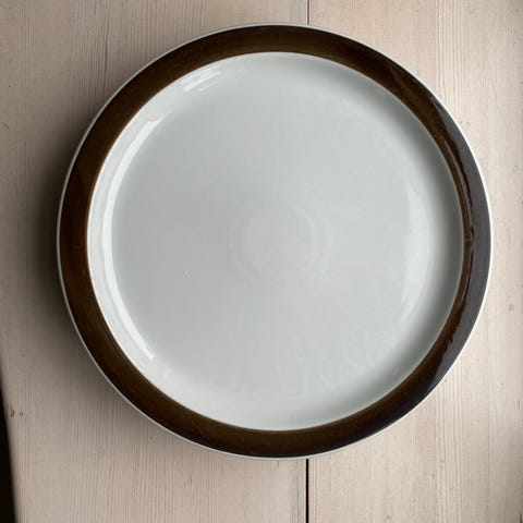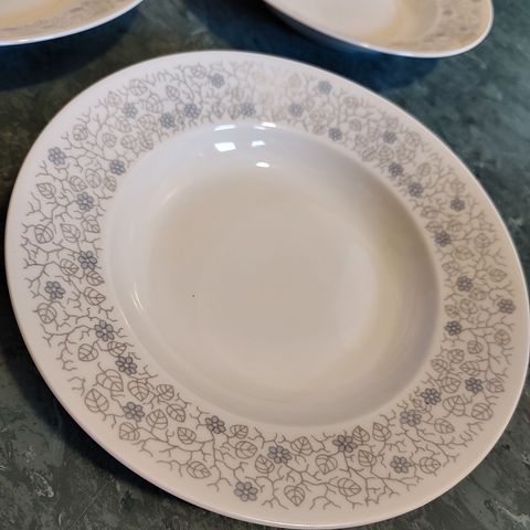 Vintage / retro Porsgrunn middagatallerken selges. Kan også brukes som et lite serveringsfat. I god stand, spesielt i forhold til alder, men "gullkanten" rundt er noe slitt enkelte steder. Se bilder. Bildet med de tre strekene er gullfarge fra produksjonen.