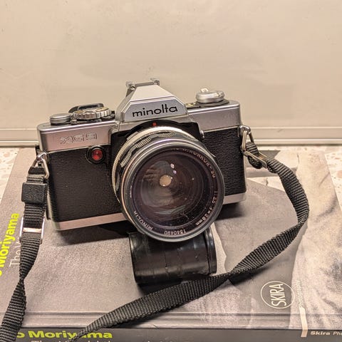 Følger med holder for lysbilder, 135‑film (et lokk har skade men funker) og 120‑film (FH-869S ; ikke i optimal stand – gummistrikkene løsner på én side).