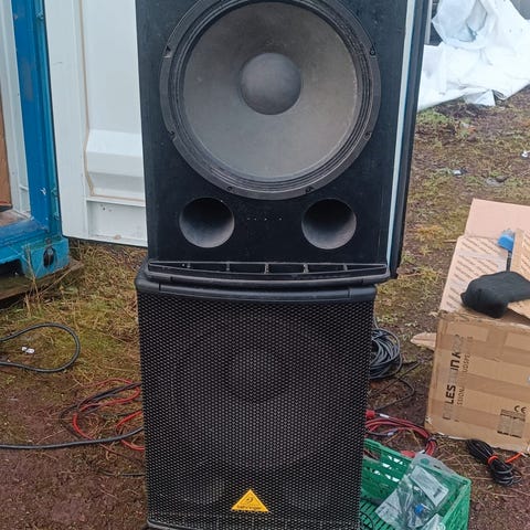 Fungerer som det skal, med god lyd. 2 sub og høyttalere. Denne kan du bruke uten mixer, og man kan koble til mixer, selges for 5500kr