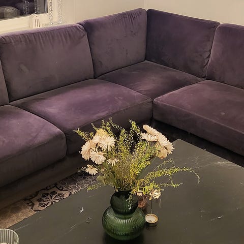 Merknader: sofa har ikke vært renset på noen år nå, og har nupper noen få plasser. Dette er ikke forsøkt fjernet.