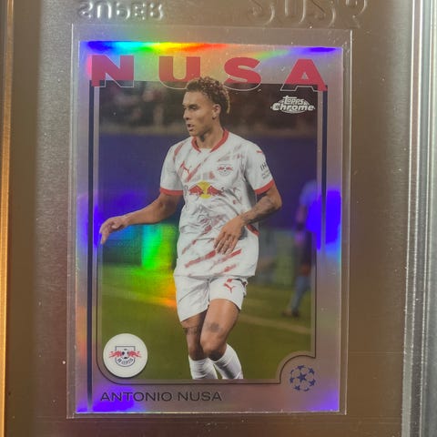 Topps Chrome Benjamin Sesko fotballkort med bilde av spilleren i spillestilling. Kortet viser spilleren i rød Red Bull-drakt og inkluderer informasjon om spilleren på baksiden. Passer for samlere av fotballkort.