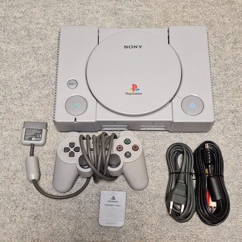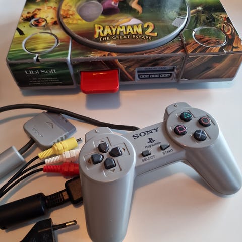 Playstation 1 med 2 stk. kontroller, 2 stk. memory cards og ett spill. Ikke brukt på veldig mange år, men den fungerer.