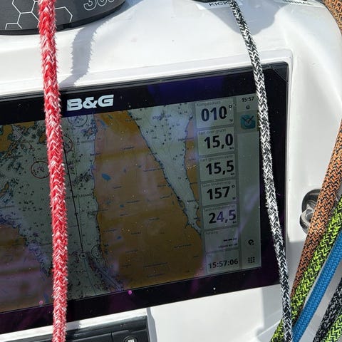 Selden. Beslag og vogner for bruk i seilbom for å kunne reve storseilet med en line.