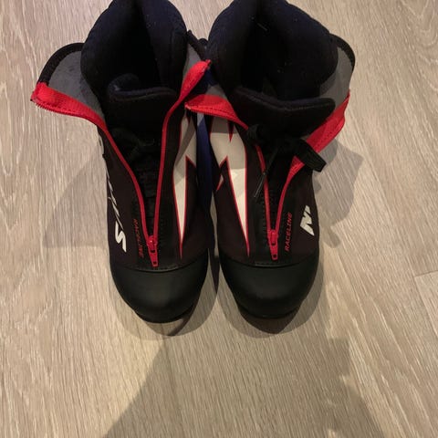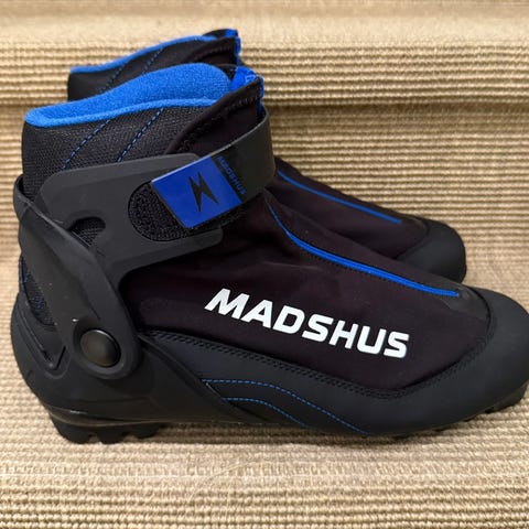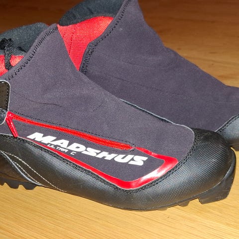 Madshus skisko i størrelse 38. Skoene er utstyrt med glidelås foran og lisser for stramming.