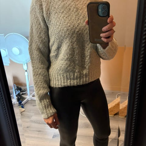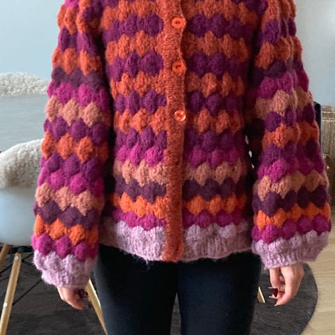 Strikket i Handycraft fluffy garn som består av Det består av 38% ull, 40% nylon og 22% akryl. God og myk.