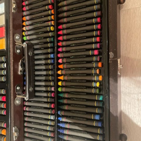 72 stk Brutfuner Macaron og 120 stk Brutfuner firkantede fargeblyanter selges i en praktisk koffert med plass til 254 blyanter. De fleste blyantene er ikke brukt.
