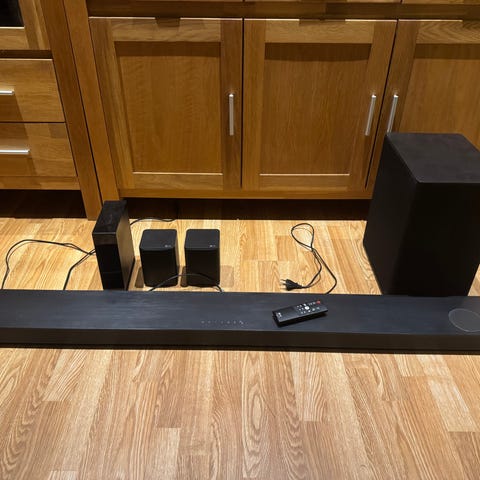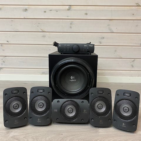 Logitech Surroundlyd Høyttalersystem med flere høyttalere og subwoofer. Systemet er designet for å gi surroundlydopplevelse i hjemmet. Passer til bruk med datamaskiner og underholdningssystemer.