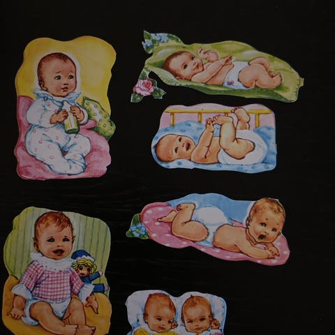 13 stk. vintage glansbilder med glitter, som viser barn i fargerike antrekk i lek, dans, fest, sang, spill, ulike aktiviteter. Fra 1960-70- tallet.