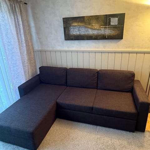 Veldig pent brukt sovesofa med sjeselong med plass til oppbevaring, mørk grå selges. Den er ca 4 år gammel. Ingen slitasje, men noen mindre bruksmerker kan nok forekomme. Sofaen er godt polstret og god å ligge og sitte i.