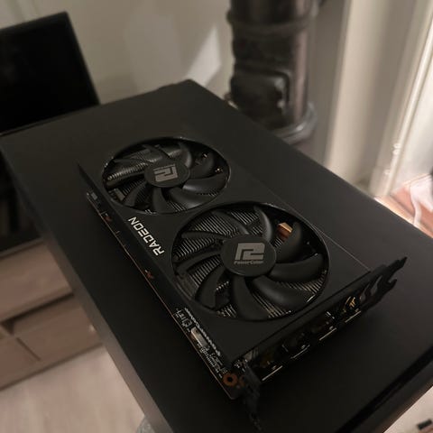 ASUS Radeon skjermkort med dobbel viftekjøling og 8gb minne. Designet for grafikkbehandling i datamaskiner.
