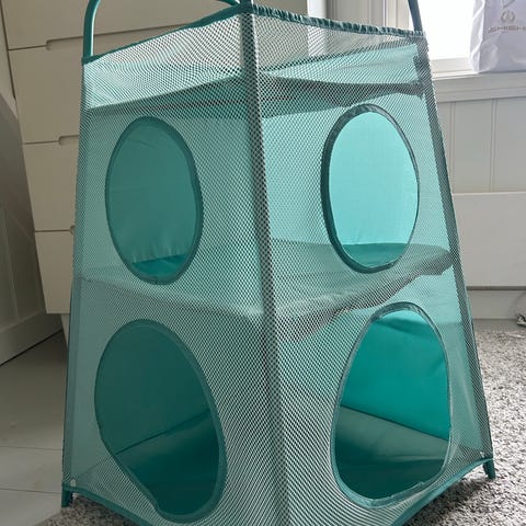 IKEA barnemøbel med oppbevaringslommer og myke puter i blått og hvitt. Passer til barnerom for organisering og lek.