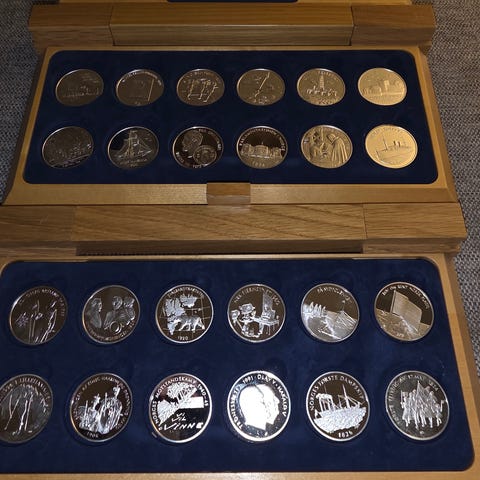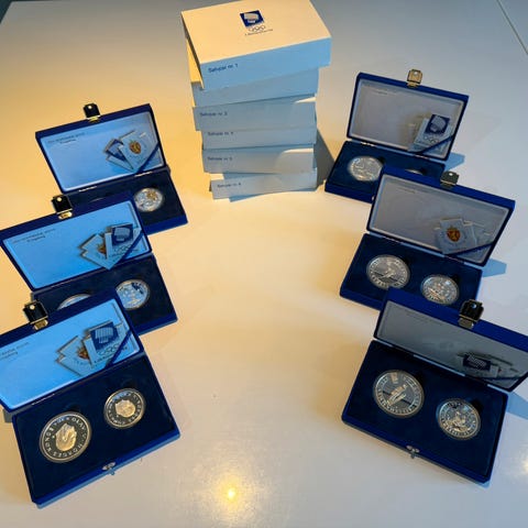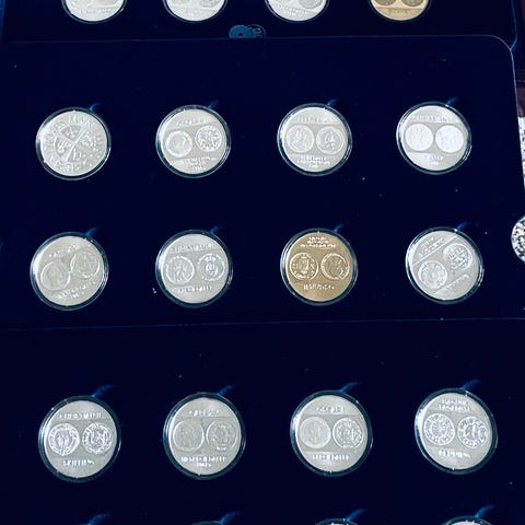 Amerikanske Sølvdollaras 786.01 gram sølv finvekt 105% av spot tror 35 av det er 0.900 sølv og 1 av disse et 40% sølv totalt 36 mynter. Kommer med dokumentasjon fra samlerhuset.