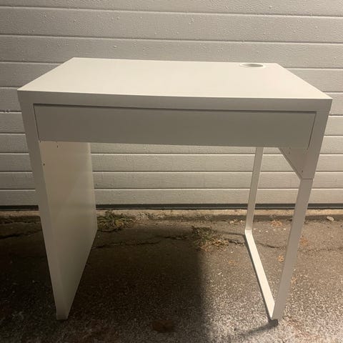 Godt brukt IKEA Micke pult selges mot henting. Den er ikke lealaus, men har noen flekker og en skramme på venstre side (se bilde). Kjøpt mars/april 2020. Det er en skuff under, og hull til ledning.
