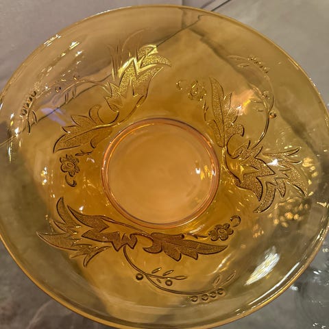 Ravfarget glassbolle med blomster- og bladmotiv.